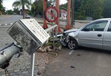 Carro bate contra canteiro e derruba câmera de segurança em Pomerode