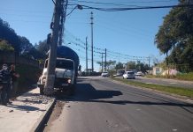 Caminhão bate em poste e interdita rua Bahia, em Blumenau