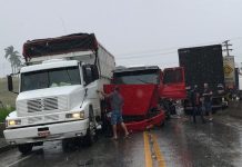 Acidente envolvendo caminhões e moto interdita ponte na BR-470, em Indaial