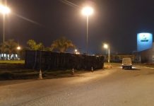 O caminhão caiu em cima da rotatória, porém o condutor não se feriu