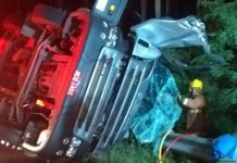 Bombeiros resgatam homem preso às ferragens de caminhão na BR-470