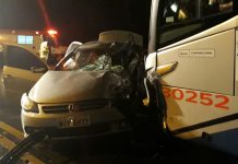 Acidente entre ônibus e carro deixa jovem preso às ferragens na Jorge Lacerda